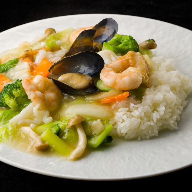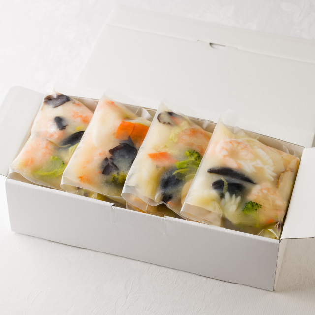 ホタテ、海老、ムール貝、イカ4種の魚介をWakiya自慢のスープで煮たうま味たっぷりの海鮮あんです。白菜、ブロッコリー、人参など野菜も彩りよく合わせました。湯煎で温め、炊き立てのご飯や焼きそば麺にかけてお召し上がりください。やさしい塩味は、幅広い年代の方に喜ばれます。冷凍庫に常備しておくと便利な一品です。
